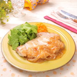 <6>を食べやすい大きさに切り器に盛りつける。<8>をかけて、お好みでグリーンリーフなどお好きな野菜を添える。