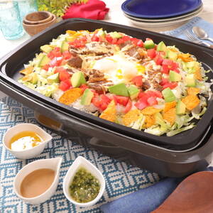チーズがとけたら蓋をあけてトマト、アボカド、レタス、お好みでコーンチップスを手でわり、盛りつける。