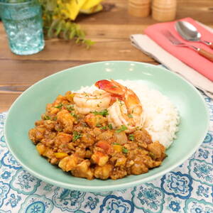 カレールーがとけたらヨーグルトを入れて混ぜ合わせる。仕上げに飾り用の海老以外を汁ごと入れて混ぜ合わせる。