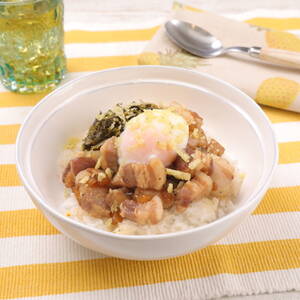 器にごはんを盛り、<5>、辛子高菜、温泉卵をのせる。砕いたポテトスティックスナックを散らす。