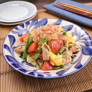 青ねぎと<5>を戻しいれて炒める。塩、粗びき黒こしょうで味を調える。器に盛り付けかつお節をかける。