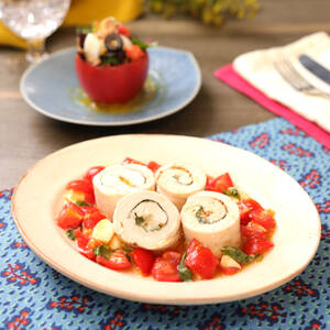 モッツァレラチーズは鶏肉に包む分(約半量)は2等分に切る。残りは4〜8等分に切る。トマトは4等分に切りボウルに入れる。