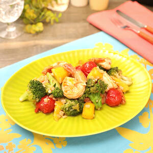 全体がなじんだらマンゴーを入れてさっくりと混ぜ合わせ、器に盛りつける。