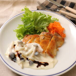 フライパンにサラダ油(分量外)をひき、弱めの中火で加熱する。鶏もも肉を皮面を下にして焼き色がつくまでパリッと焼く。