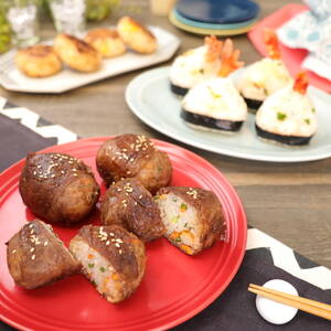 更に横に広げた牛肉の上に縦に置いて巻き、軽く握り形を整える。同様に3個つくる。