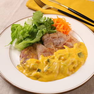 こしょう少々(分量外)し、薄力粉を両面に薄くまぶす。フライパンにサラダ油をひいて中火で熱して豚肉を並べる。