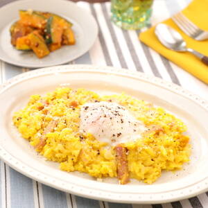 器に盛り付け中央に温泉卵をのせる。お好みで黒こしょうと粉チーズをふる。