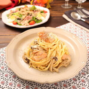 秋鮭の醤油カルボナーラ