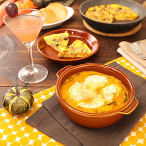 玉ねぎはくし切りにする。カマンベールは厚みを半分に切る。かぼちゃの粗熱がとれたら潰しやすい大きさにざく切りにする。