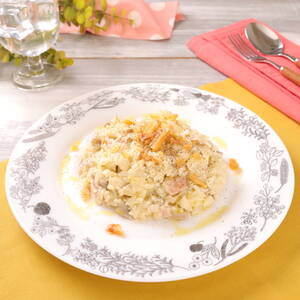 器にもりつけ<3>を散らす。粉チーズ(分量外)をかけ、お好みで粗びき黒こしょう、オリーブオイルをまわしかける。