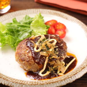 <6>をハンバーグにかけ、マヨネーズ、かつお節、青のりをトッピングする。 お好みでグリーンリーフとトマトを添える。
