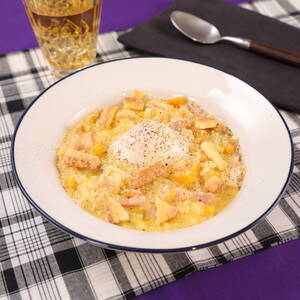 器に盛り付け中央に温泉卵をのせる。砕いたパイを散らす。お好みで黒こしょうと粉チーズもふる。