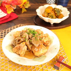 器に唐揚げを盛り付け、まいたけあんかけをかける。お好みで青ねぎを散らす。