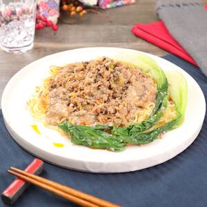 <3>に<9>、<7>を半量ずつ盛りつける。お好みでラー油をまわしかけ、チンゲン菜を添える。