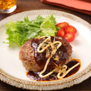 <6>をハンバーグにかけ、マヨネーズ、かつお節、青のりをトッピングする。 お好みでグリーンリーフとトマトを添える。