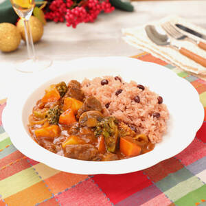 バターがなじみブロッコリーに火が入ったら火を止める。器に赤飯とビーフシチューを盛りつける。