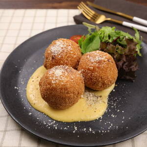 6等分して丸く成型する。ボウルに卵1個、【B】を混ぜ合わせてくぐらせ、パン粉をしっかりまぶす。