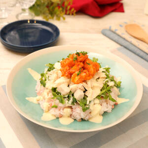 別のボウルにご飯、<12>を入れて切るように混ぜ合わせ、器に盛りつける。