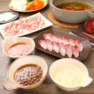 火が入ったらぶり、豚肉、ワンタンの皮を1枚ずつくぐらせて火を通す。具材と一緒にお好きなたれにつけてお召し上がり下さい。