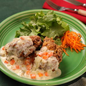 6〜7分ほど揚げて全体がカリッカリになったら器に盛り付け、<4>を温め直してかける。
