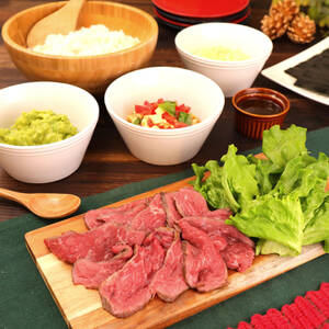 <6>を薄く切る。海苔、酢飯、グリーンリーフ、<6>をのせる。<7>をかけ、お好みの具材をのせて巻く。
