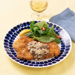 豚肉の筋を切り、麺棒や包丁の背で叩き、薄く伸ばす。両面に塩、粗びき黒こしょう少々(分量外)をする。