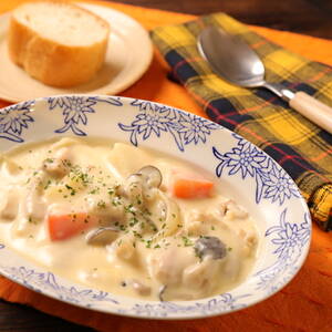 牛乳、コンソメを加えてまぜながら中火にかける。とろみがついたら弱火におとし、時々まぜながら1~2分加熱する。