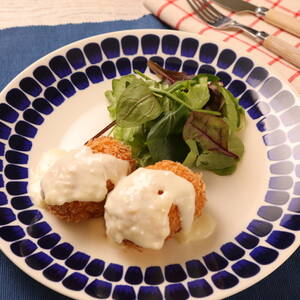 <5>を4等分にして分けて俵型に成形する。【B】を混ぜ合わせてくぐらせ、パン粉をまぶす。