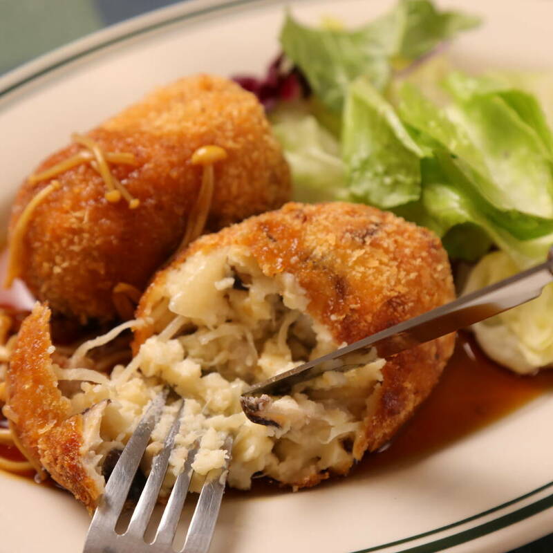 <5>を4等分にして俵型に成形する。【B】を混ぜ合わせてくぐらせパン粉をまぶす。