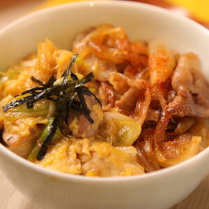 器にご飯を盛り付け、<4>と<6>を半分ずつかける。<4>にはお好みで一味、<6>には刻み海苔を添える。