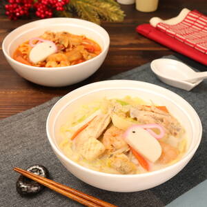 <7>を<6>に入れてひと煮立ちさせる。器に盛りつけ、うさぎのかまぼこを飾る。お好みでラー油(分量外)をまわしかける。