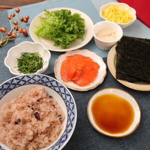 のりに赤飯を敷き、レタス、大葉、サーモン、ツナマヨ、錦糸卵の好きな具材をまき、タレをつける。