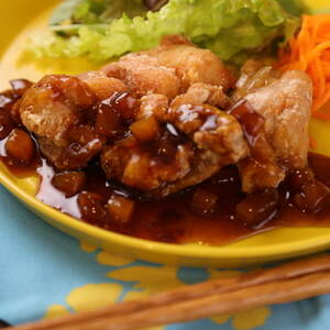 <1>に【C】をまぶす。中温に熱したサラダ油で6~7分揚げる。器に盛り付け<4>をかける。