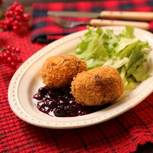 4等分にして俵型に成形する。【B】を混ぜ合わせてくぐらせパン粉をつける。