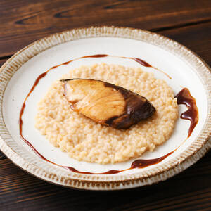 <11>をお皿に盛り付け、上にぶりの照り焼きをのせる。煮詰めたたれを盛りつける。