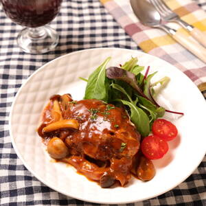 赤ワインのアルコールを飛ばしたら【B】、マッシュルーム、しめじを加えてひと煮たちさせる。