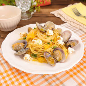 蓋をしてあさりの口が開くまで蒸す。全て開いたらパスタの茹で汁を60ml程度(約お玉1杯分)を入れて沸騰させる。