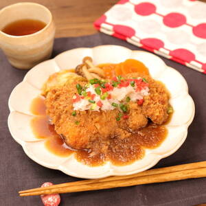 <4>を入れて煮汁をかけながら1分ほど煮る。器に盛り付けて大根おろしと青ねぎとカリカリ梅を散らす。