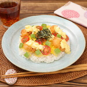 器に酢飯を盛り、錦糸卵を広げる。エビフライ、アボカド、ミニトマトを散らす。