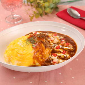 <10>に<4>をかける。デミグラスソースの上に生クリームをかけ、いちごを散らす。