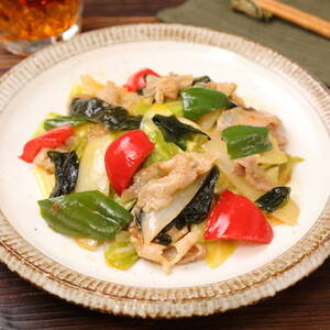焼き色がついたらピーマン、パプリカ、玉ねぎを加え、強火でさっと炒める。キャベツを加えてさらに炒める。
