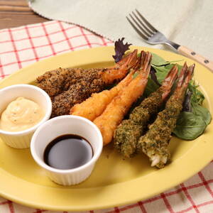 【B】を混ぜ合わせてえびをくぐらせる。2本ずつ<4>の3種類のパン粉につける。