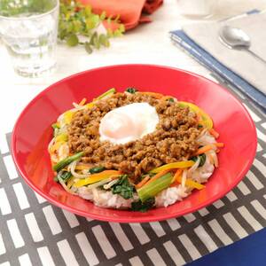 器にご飯をよそい<4>、<9>を盛りつける。中央を軽くへこませて<1>を割りのせる。