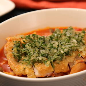 器に盛りつけスープを注ぐ。鶏肉の皮面に<4>を乗せる。