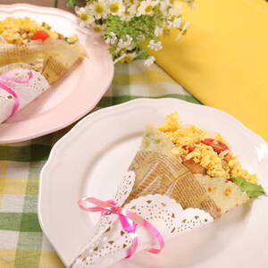 <4>に適度な大きさに千切ったフリルレタス、<5>、ミニトマトを載せて両側から折りたたむ。ブーケの用にゆで卵を散らす。