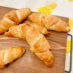 バターを巻き込んで巻いていく。巻き終わりをつまみ、巻き終わりが下になるようにして天板に置く。同様に5つ作る。