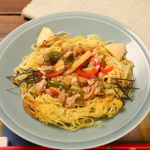 パプリカ、ピーマン、たけのこを加えてさっと炒め合わせる。