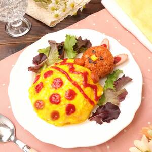 ラップを使い、<10>を卵型に整える。<7>の丸めたケチャップライスをもりつけ<3>を半量ずつ盛りつける。