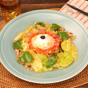 焼き色がついたらピーマン、玉ねぎを加え、強火でさっと炒める。キャベツを加えてさらに炒める。