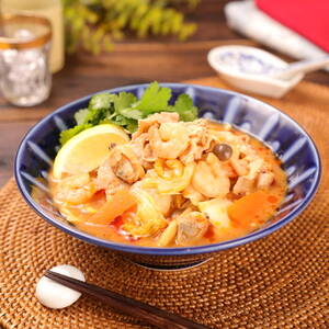 <8>を<6>に入れてひと煮立ちさせ、器に半量ずつ盛りつける。お好みでパクチー、レモンを盛りつけ、ラー油をまわしかける。